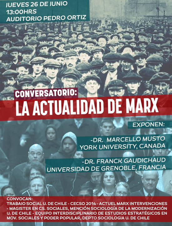 La Facultad de Ciencias Sociales de la Universidad de Chile tiene el agrado de invitar a usted al conversatorio titulado “La actualidad de Marx”. Expondrán el Dr. Marcelo Musto de la York University de Canadá y el Dr. Franck Gaudichaud de la Universidad de Grenoble III, Francia.