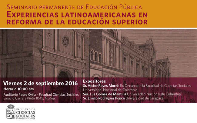 La sesión del Seminario permanente de Educación Pública de este viernes tendrá por título “Experiencias Latinoamericana en Reforma de la Educación Superior”, cuyas exposiciones estarán a cargo del Sr. Víctor Reyes Morris, ex Decano de la Facultad de Ciencias Sociales de la Universidad Nacional de Colombia, Sra. Luz Gómez de Mantilla, Universidad Nacional de Colombia y Sr. Emilio Rodríguez Ponce, de la Universidad de Tarapacá.