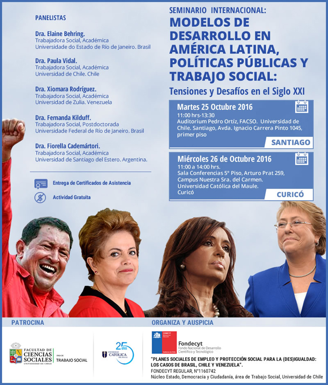 El Seminario Internacional "Modelos de Desarrollo en América Latina, Políticas Públicas y Trabajo Social: Tensiones y Desafíos en el Siglo XXI" se realizará el Martes 25 de Octubre a las 11.00 horas en el Auditorio Pedro Ortiz de la Facultad de Ciencias Sociales de la U. de Chile. Una segunda sesión se realizará el Miércoles 26 de Octubre, también a las 11.00 horas, en la Universidad Católica del Maule, ciudad de Curicó.