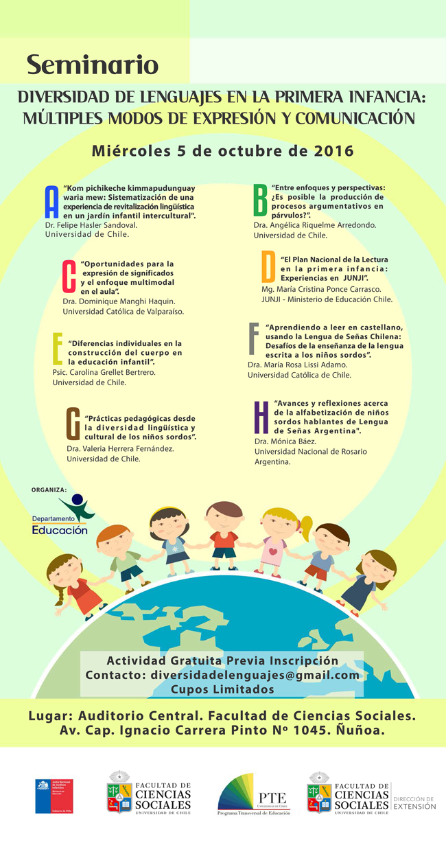El Seminario "Diversidad de lenguajes en la Primera Infancia: múltiples modos de expresión y comunicación" tiene por objetivo dar a conocer y reflexionar, en base a diversas investigaciones y prácticas pedagógicas, sobre la adquisición y el desarrollo lingüístico, el bilingüismo y la interculturalidad, la valorización y revitalización de lenguas minoritarias, las experiencias de aproximación al lenguaje escrito y las múltiples modalidades de expresión y comunicación en la primera infancia.