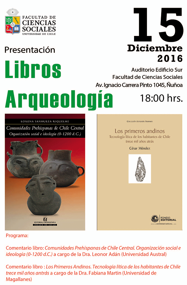 El próximo jueves 15 de Diciembre, a las 18.00 horas, se presentarán dos libros de Arqueología en el Auditorio central de la Facultad de Ciencias Sociales de la U. de Chile (edificio rojo).