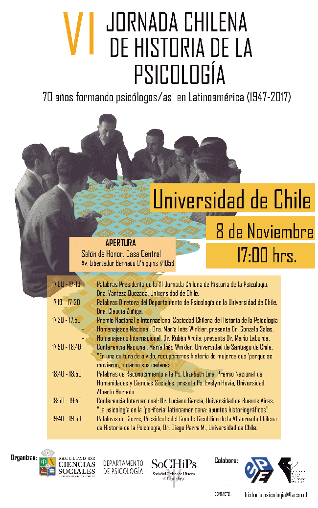 Los días 08, 09 y 10 de Noviembre de 2017 se realizará la VI Jornada Chilena de Historias de la Psicología, encuentro que se enmarca en la conmemoración de los 70 años desde que se inició el primer programa de formación de psicólogos/as en la Facultad de Filosofía y Educación de Universidad de Chile, institución pionera en Latinoamérica (1947). Las actividades se desarrollarán en Casa Central y en la Facultad de Ciencias Sociales de la U. de Chile.