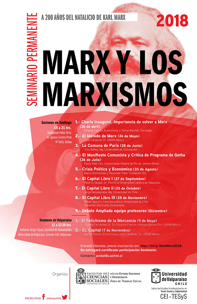 En el marco de los 200 años del natalicio de Karl Marx, se realizará un seminario permanente titulado “Marx y los Marxismos”, que tendrá lugar, principalmente en el Auditorio Pedro Ortiz de la Facultad de Ciencias Sociales de la U. de Chile.