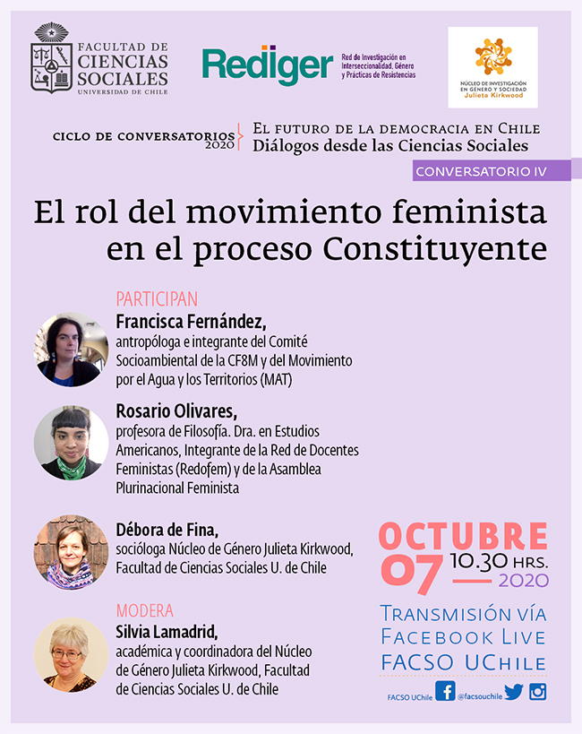 En el marco del Ciclo de Conversatorios "El futuro de la democracia en Chile: diálogos desde las Ciencias Sociales", de cara al Plebiscito de Octubre 2020, la Facultad de Ciencias Sociales de la U. de Chile invita a toda la comunidad al Conversatorio IV titulado "El rol del movimiento feminista en el proceso constituyente". Contará con la participación de Francisca Fernández, antropóloga e integrante del Comité Socioambiental de la CF8M y del Movimiento por el Agua y los Territorios (MAT); Rosario Olivares, profesora de Filosofía, Dra. en Estudios Americanos, Integrante de la Red de Docentes Feministas (Redofem) y de la Asamblea Plurinacional Feminista, y Débora de Fina, socióloga Núcleo de Género Julieta Kirkwood U. de Chile. Modera Silvia Lamadrid, académica y coordinadora del Núcleo de Género Julieta Kirkwood U. de Chile