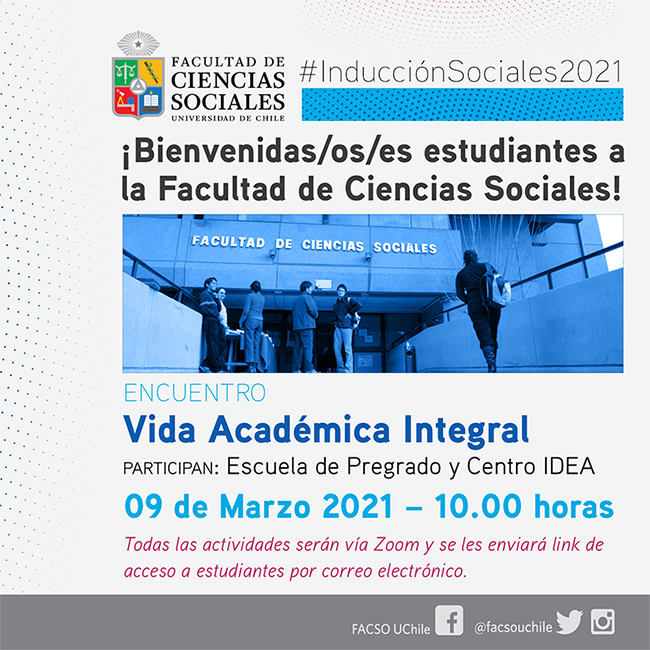 ¡Invitamos a estudiantes que ingresan a la Facultad de Ciencias Sociales a participar de la Inducción 2021! Entre el 09 y 12 de Marzo habrán actividades de encuentro virtual entre Estudiantes y Unidades de Apoyo Estudiantil para que conozcan los procesos, rutas y funcionamiento de los equipos en su paso por la Facultad.
