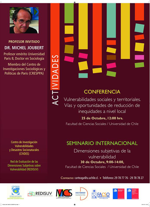 El objetivo de la Red de Evaluación de las Dimensiones Subjetivas de la Vulnerabilidad (REDISUV) es compartir los resultados de investigación en torno a nuevas vulnerabilidades y procesos de vulnerabilización, con el fin de generar marcos teóricos y metodológicos para el estudio comparado de las dimensiones subjetivas de la vulnerabilidad en Chile y Europa. Por ello, la visita del Dr. Joubert a la Universidad de Chile, profundiza este interés de la REDISUV y del Centro de Investigación en Vulnerabilidades y Desastres Socionaturales (CIVDES), a la vez que busca instalar la categoría de vulnerabilidad como una herramienta conceptual, moral y política para el análisis de la realidad social.