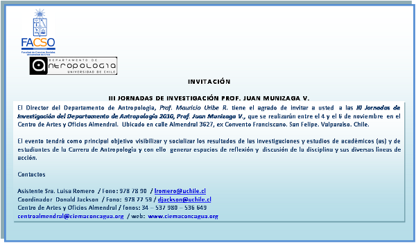 Se convoca a las III Jornadas de Investigación del Departamento de Antropología de la Universidad de Chile, las que, esta vez estarán dedicadas al académico e impulsor de la Antropología Física en Chile, Profesor Juan Munizaga V. En esta oportunidad estas jornadas se celebran en el marco del Bicentenario, por lo que es bienvenida una evaluación de los logros alcanzados en la investigación y formación en la Antropología en Chile.