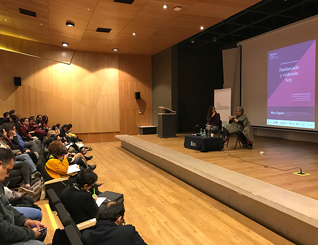 Frente a más de 300 personas en el Auditorio Julieta Kirkwood, la investigadora dio la conferencia "Patriarcado y Violencia Hoy" donde hizo un repaso por sus principales investigaciones y libros publicados, ahondando en la violencia contra las mujeres y las nuevas formas de la guerra de la perspectiva de la colonialidad del poder. Destacó que la relación de género se constituye por realidades históricas, siendo ésta “una afirmación indispensable, porque de no decir que hombres y mujeres son entidades históricas no se podrán cambiar”.