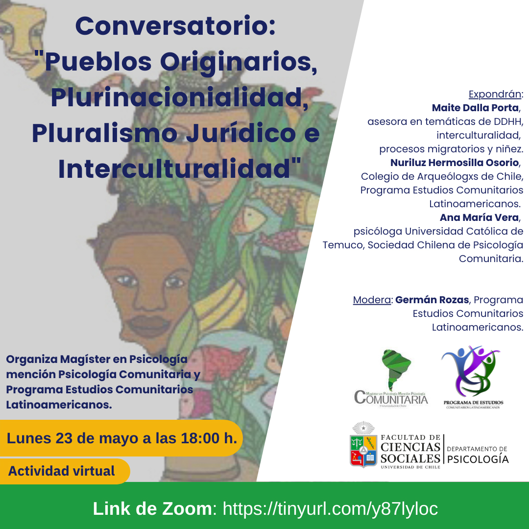 El Magíster en Psicología mención Psicología Comunitaria, en colaboración con el Programa de Estudios Comunitarios Latinoamericanos, realizarán el conversatorio "Pueblos Originarios, Plurinacionalidad, Pluralismo Jurídico e Interculturalidad".