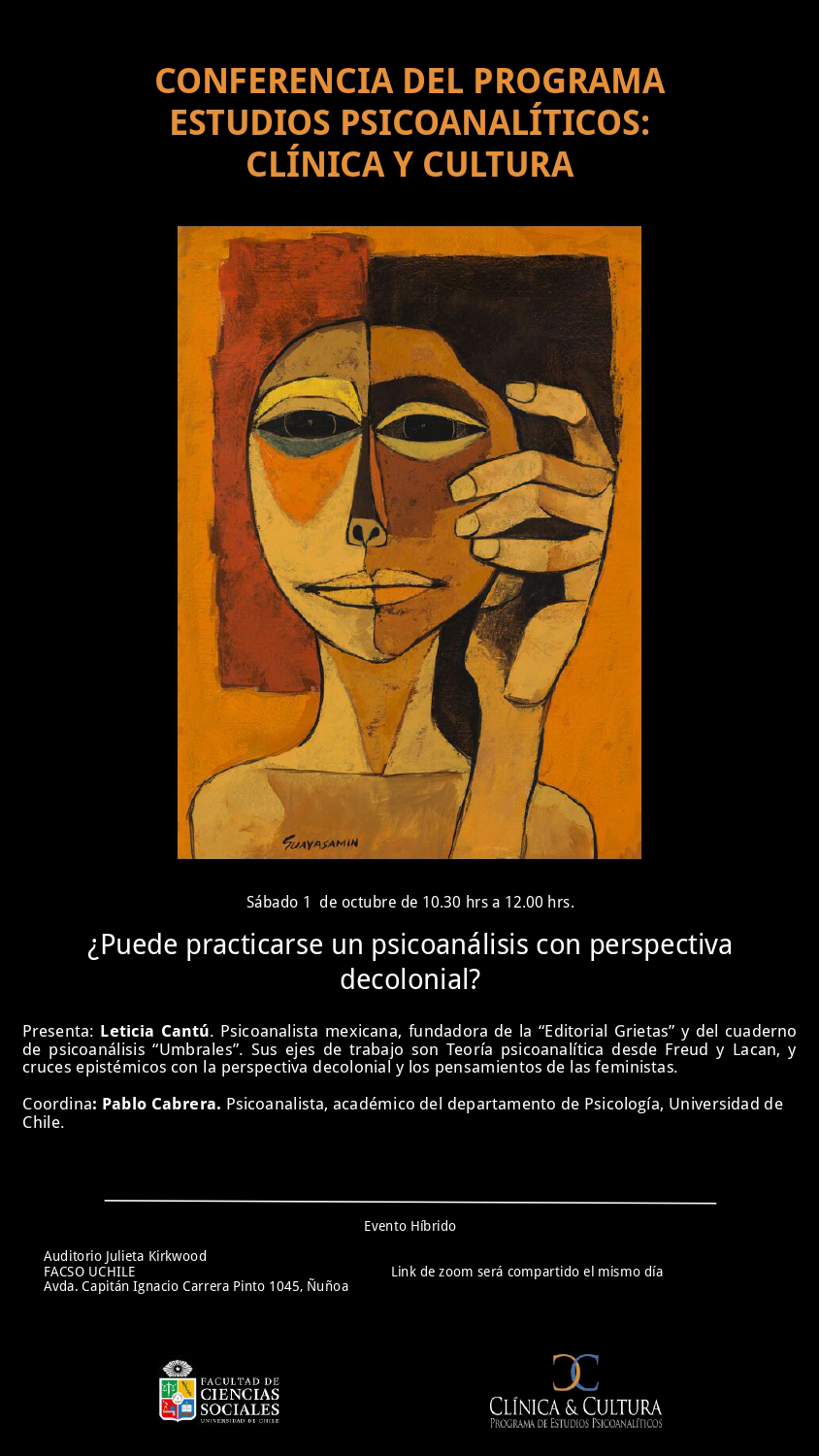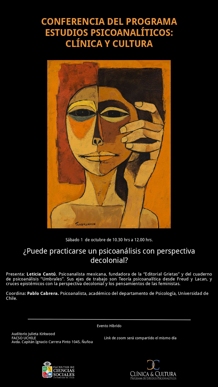 La conferencia del Programa Estudios Psicoanalíticos: Clínica y Cultura se realizará el sábado 01 de Octubre 2022 a las 10.30 horas, en el Auditorio Julieta Kirkwood de la Facultad de Cs. Sociales de la U. de Chile. Será en formato híbrido.