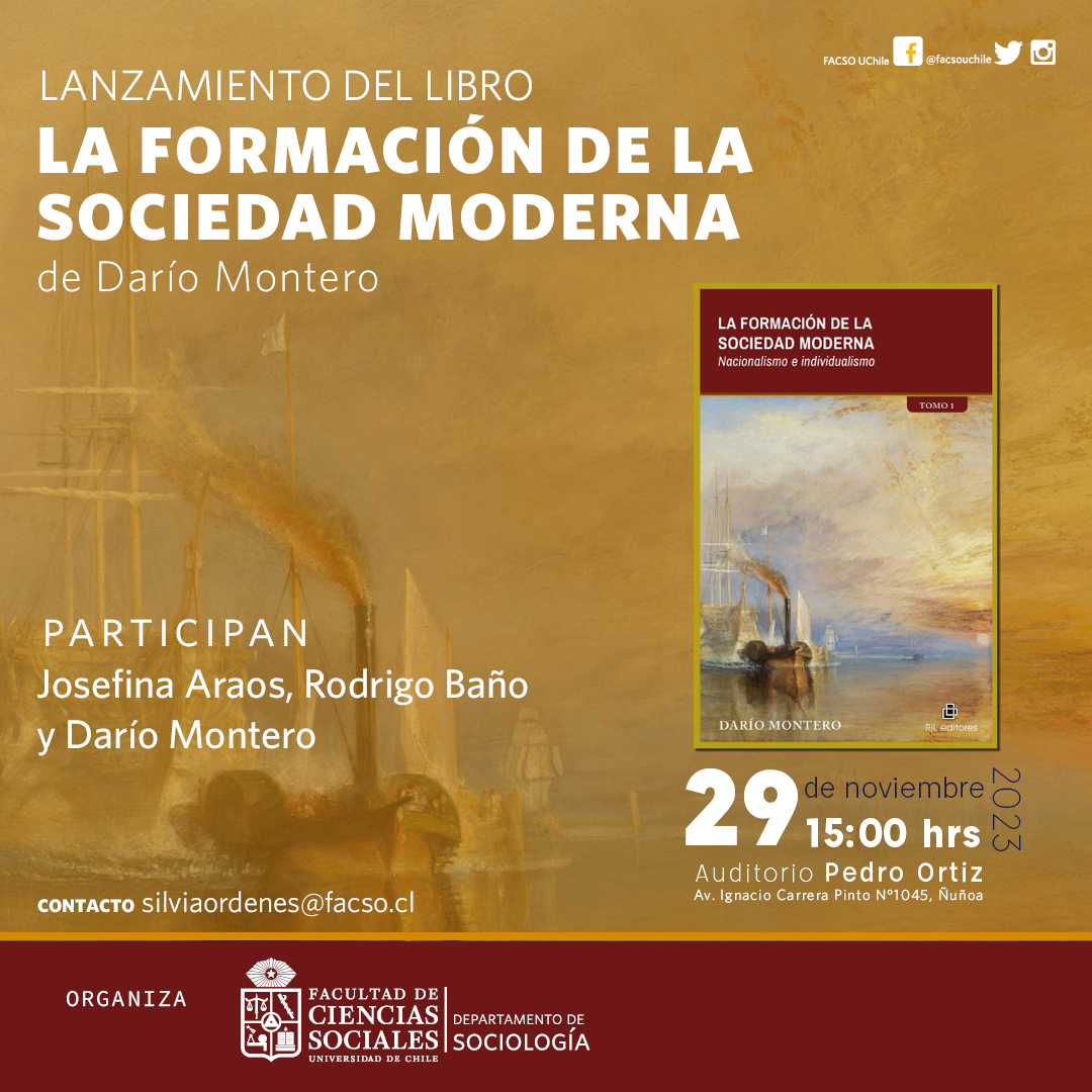 El Lanzamiento del libro “La formación de la sociedad moderna” de Darío Montero tendrá por panelistas a Josefina Araos, Rodrigo Baño y Darío Montero. Se realizará el 29 de Noviembre de 2023, a las 15 horas, en el Auditorio Pedro Ortiz.