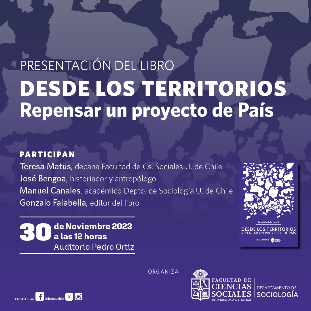 En el marco de los 65 años del aniversario de Sociología, se realizará la Presentación del libro “Desde los territorios. Repensar un proyecto de País” editado por el académico del Depto. de Sociología U. de Chile, Gonzalo Falabella.