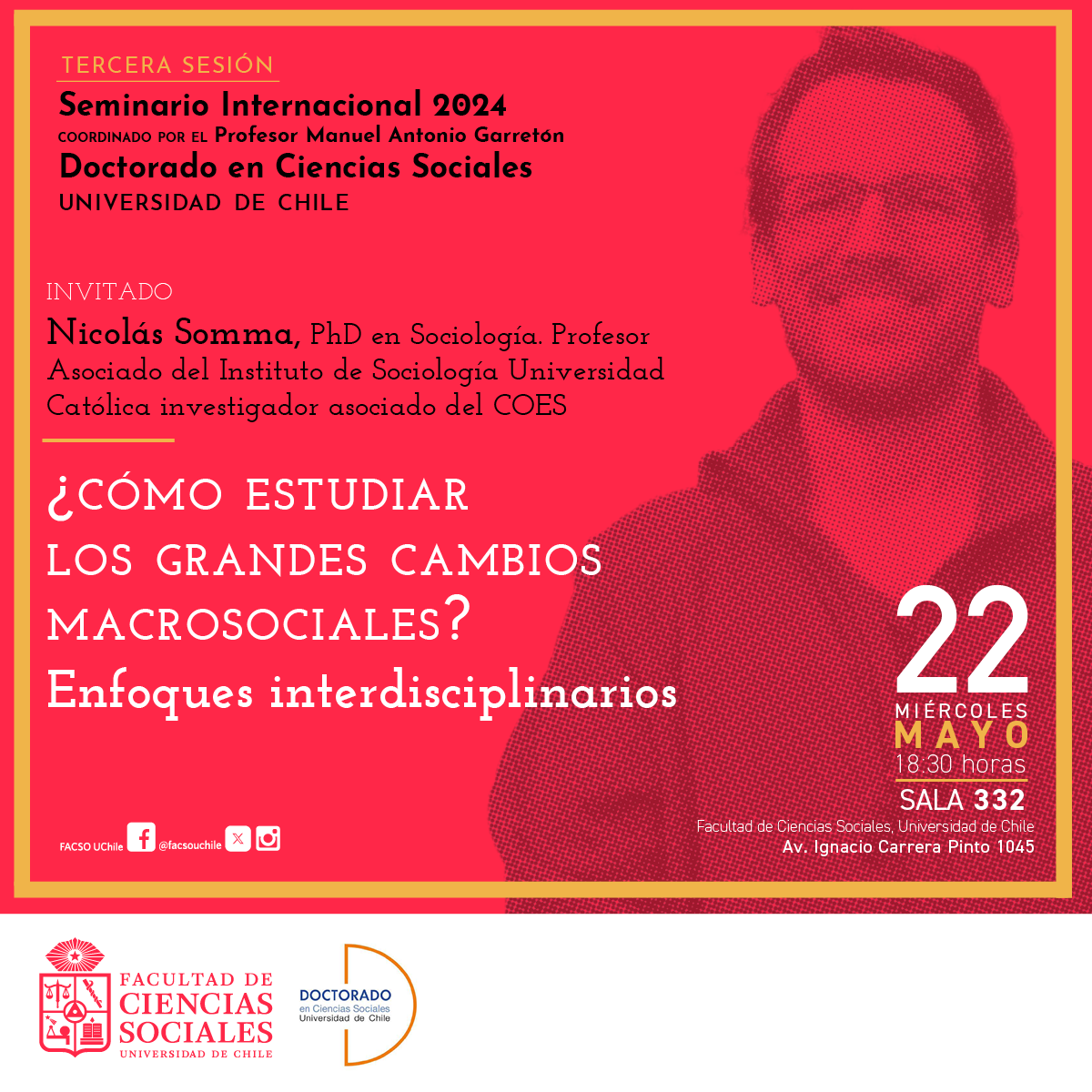 La Tercera sesión Seminario Internacional Doctorado en Ciencias Sociales 2024 Universidad de Chile, se realizará 22 de mayo a las 18:30 hrs. Dicha sesión tendrá por nombre "¿Cómo estudiar los grandes cambios macrosociales? Enfoques interdisciplinarios".