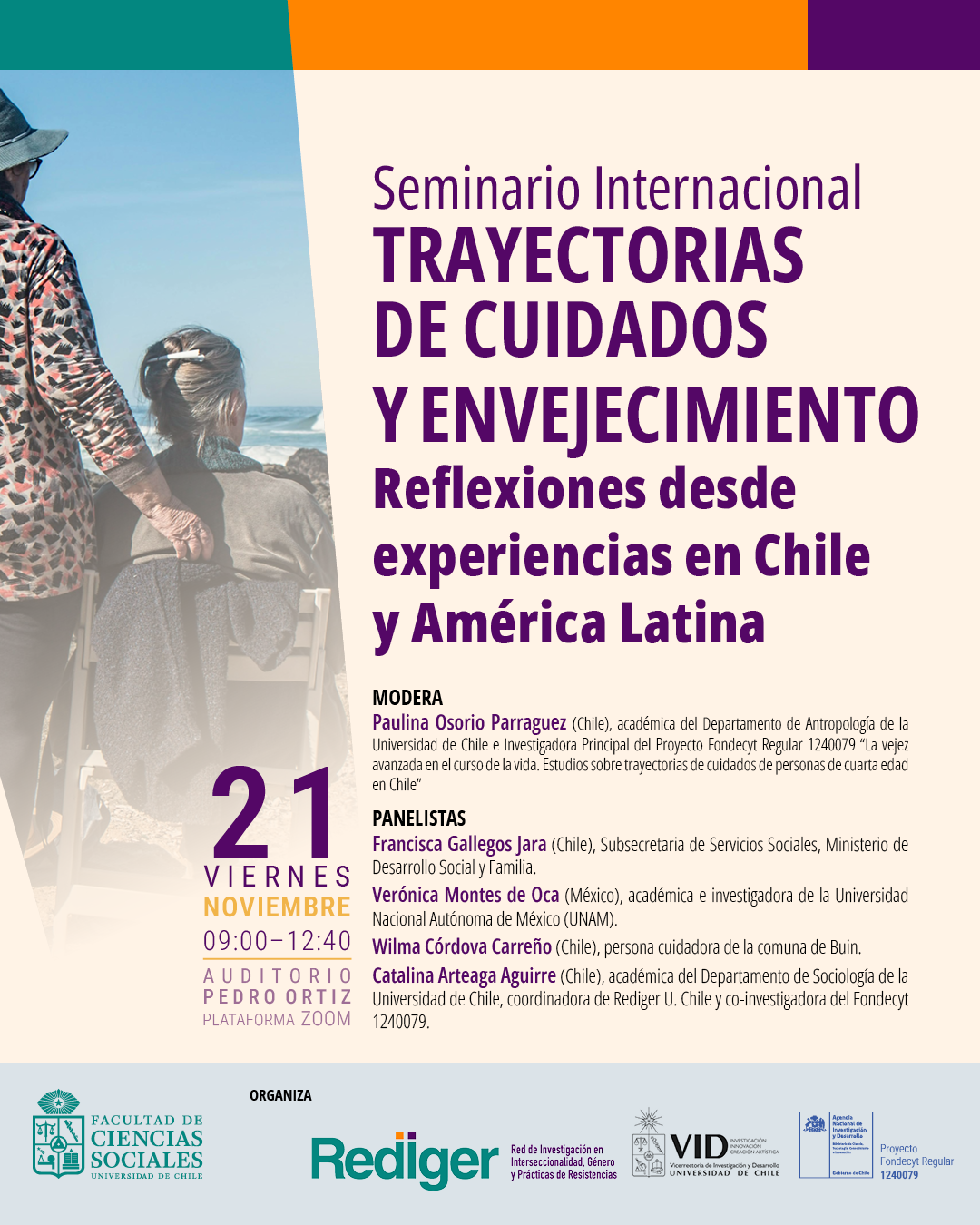 Organizan: Red de Investigación en Interseccionalidad, Género y Prácticas de Resistencia de la Universidad de Chile (Rediger) y Proyecto Fondecyt Regular 1240079 “La vejez avanzada en el curso de la vida. Estudios sobre trayectorias de cuidados de personas de cuarta edad en Chile”, con el apoyo de la Agencia Nacional de Investigación y Desarrollo (ANID) y la Vicerrectoría de Investigación y Desarrollo (VID).