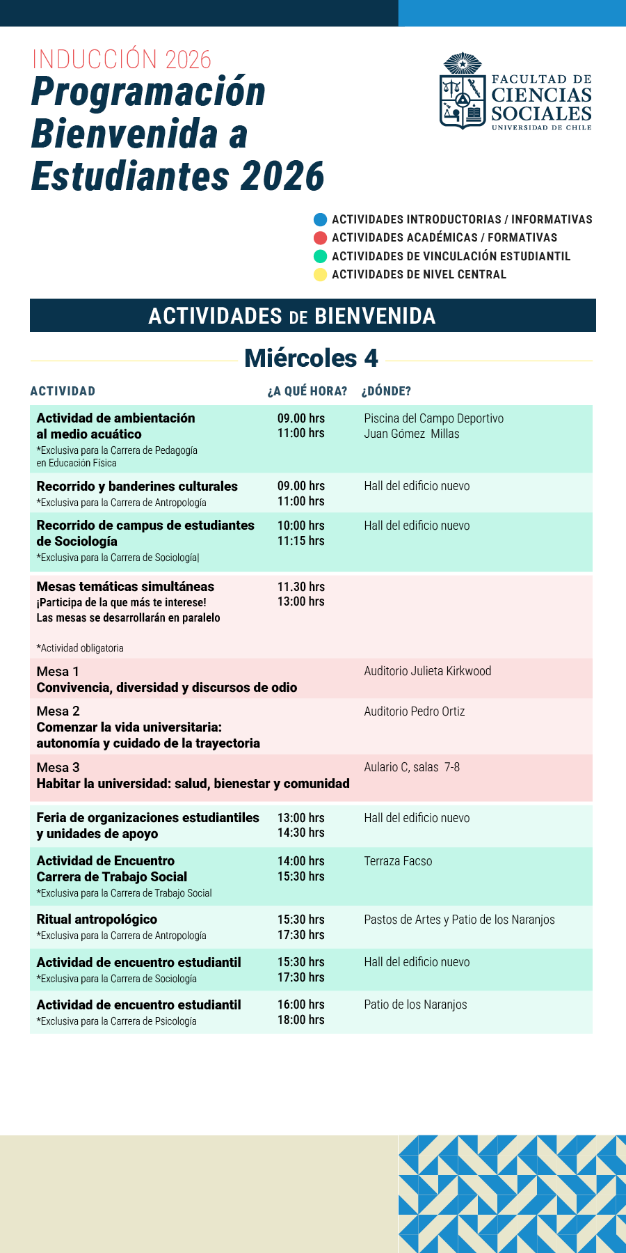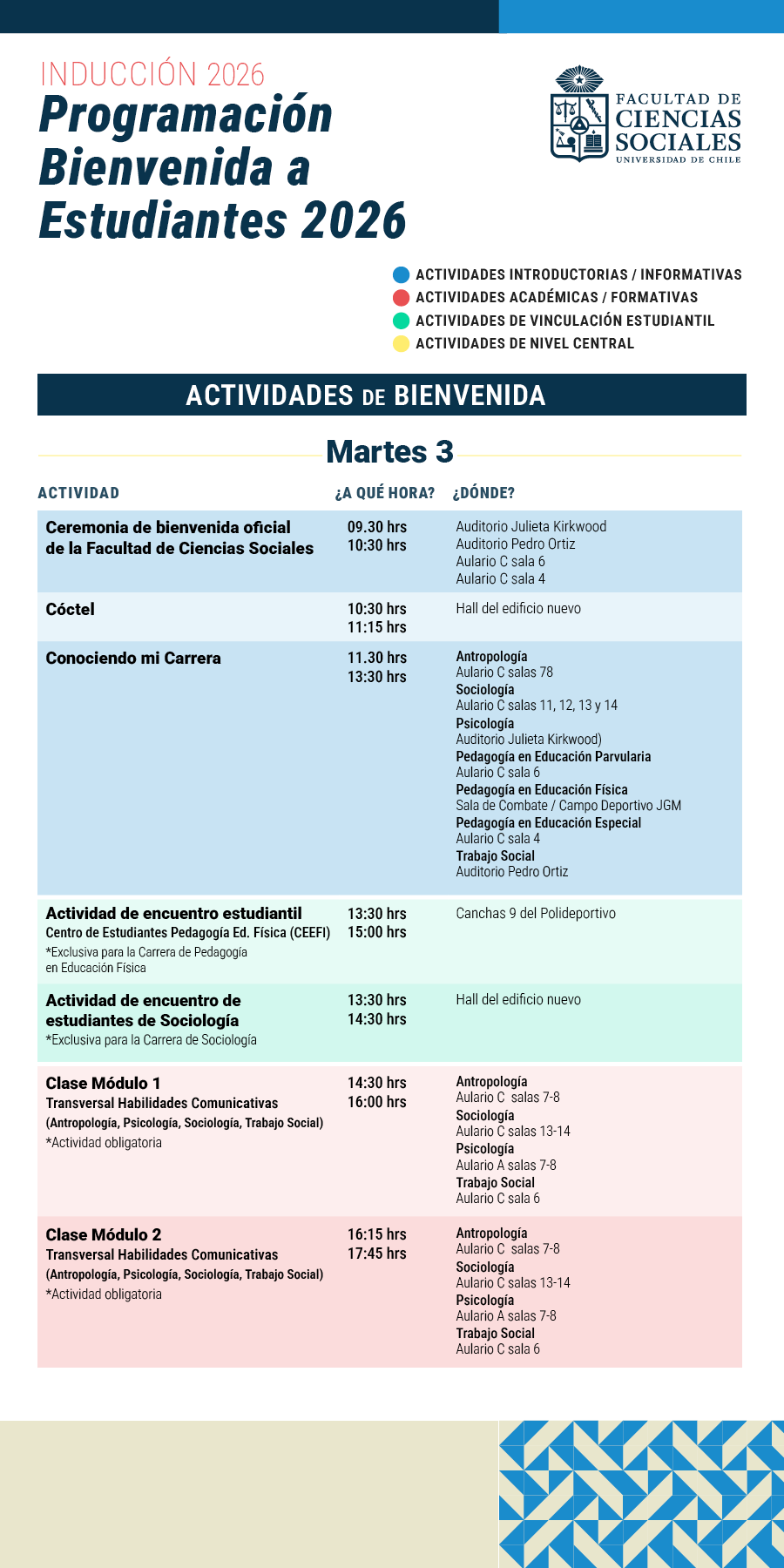 La Facultad de Ciencias Sociales de la Universidad de Chile tiene el agrado de invitar a todos/as/es los/as/es estudiantes nuevos de primer año de las siete carreras de Pregrado, a asistir y participar activamente de las actividades de Inducción que se realizarán del 03 al 11 de marzo 2026.