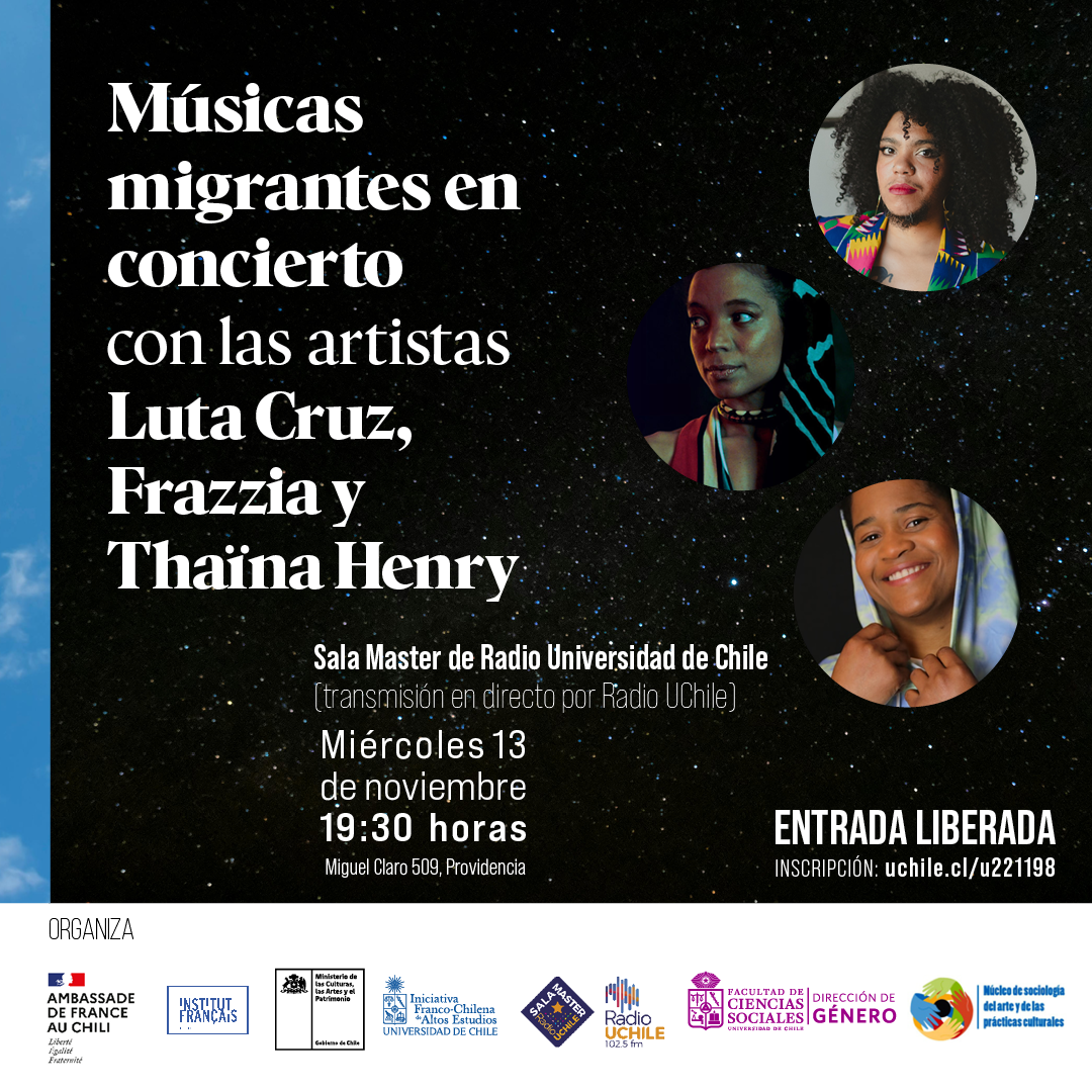 Músicas migrantes en concierto con las artistas Luta Cruz, Frazzia y Thaïna Henry es un concierto que se realizará el 13 de noviembre 2024 a las 19.30 horas, en la Sala Master de Radio Universidad de Chile, con entrada liberada previa inscripción.